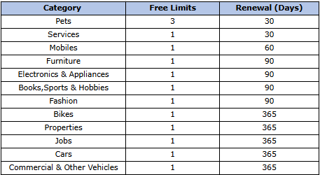 Please note that every category has a certain limit on where you can post the Ad for free. Kindly refer to the threshold for Free Limits across India in different categories: