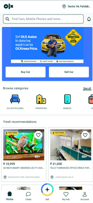 अपना पसंदीदा समान खोज रहे है। OLX आपको आपकी पसंद की आइटम को खोजने के लिए 2 बहुत आसान विकल्प प्रदान करता है।